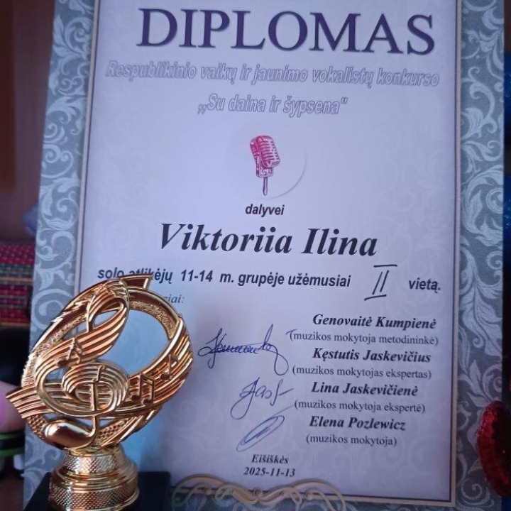 2025 - 11 – 08 vyko Vilniaus miesto politinių kalinių ir tremtinių bendrijos Fabijoniškių skyriaus tremtinių susitikimas, kuriame dalyvius muzikine programa pasveikino kamerinis choras, 8 c kl. mokinė Viktoriia Ilina, III a G kl. mokinė Beatričė Žikulina. Nepakartojamas vakaras ilgam išliks atmintyje. 2025 - 11 – 13 Eišiškių Laisvalaikio ir Verslo centro koncertų salėje vyko Respublikinis vaikų ir jaunimo vokalistų konkursas „Su daina ir šypsena“. Konkurse puikiai pasirodė 8c kl. mokinė Viktoriia Ilina, kuri pelnė II vietą. Sveikiname nugalėtoją! 2025 - 11 – 15 kamerinis choras dalyvavo Tarptautiniame šokio ir vokalo festivalyje „Travelling festival. Prague 2025“, vykusiame Prahoje, Čekijoje.